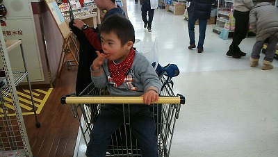 今年最後の買い物に。 Hがどうしても勝手に走って行ってあいまうため、仕方なくカートに乗せた。 どうしたら、付いて来てくれるようになるのだろうか。 困ったものだ。 |