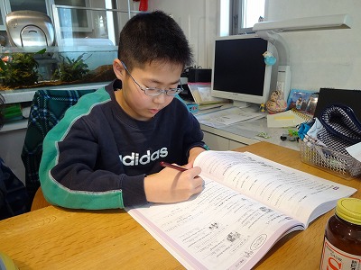 Sは勉強追い込み。 右ひじはシップで固め、かろうじて勉強に耐える。 そう、やっぱり肘を少し痛めたようだ。 |