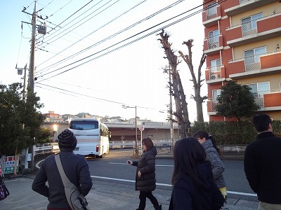 バスから降りてくる。