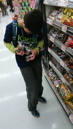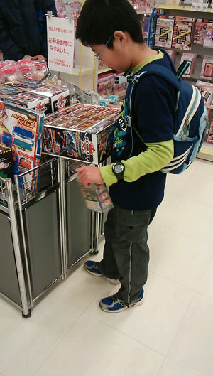 続いて食品売り場、菓子の景品。 今日から新発売、全部ある! と、子供なのに大人買い。 時間が経つと品切れで揃わなくなるそうだ。 |