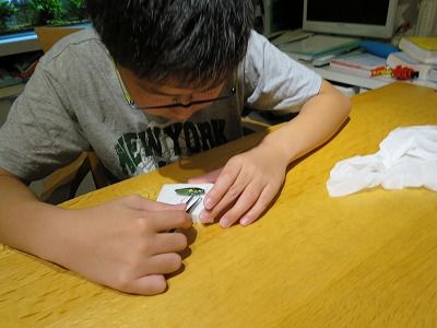 夜、1年ピン止めのまま放置したムシを標本に。 |