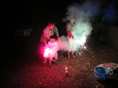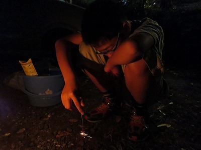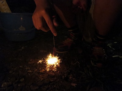 夜のイベントに花火を持参していたが、突然どしゃ降りに。
