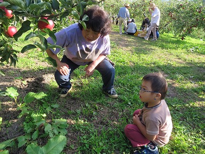 リンゴ狩り。 おばさんにも抱っこをせがむH。 |