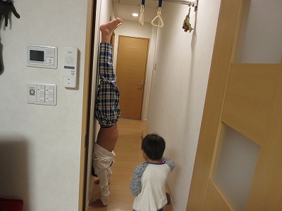 Sの体重約40s、バーの重さ20s。 自重で釣り輪等にぶら下がれるのに、半分の重さが握れない? 思い込みって、凄いだろう。 自ら力をセーブしてたんだぜ。 |