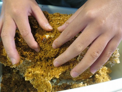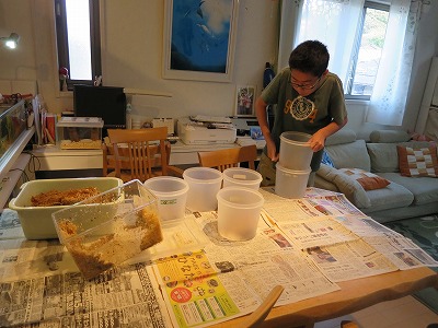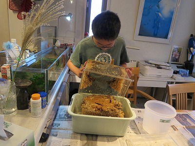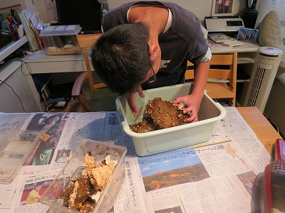 試験から帰ると、早速、クワ幼虫の割り出し。
