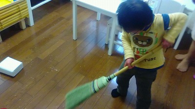 米粒を床にぶちまけても、掃き散らかしても、好きなだけやらせる。