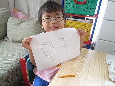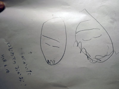 Hが初めて顔を描けた、と、おママは大喜び。 永久保存版にするそうだ。 |