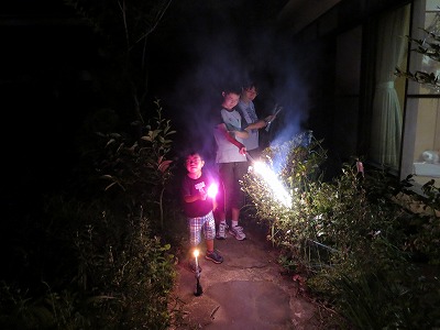 花火。 置き花火に火をつけるのを怖がっていたが、慣れたらそれなりに。 |