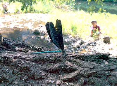 | ボディーがメタリックなトンボも、たくさん。 羽黒トンボというらしい。 見たまんまやね。 |