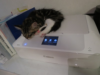 プリンタの上を歩いて、電源ボタンを入れてしまう。 その度にインクが減るのだぞ・・・! |
