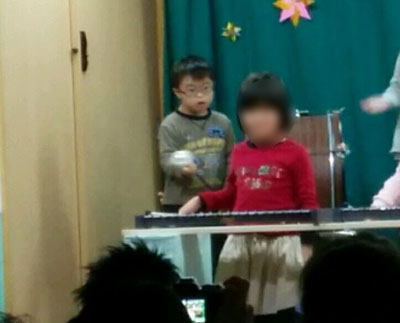 もう一つの出し物は、劇。 靴屋の小人役。 羽織ものを自力でまとえなかったが、帽子をかぶって、遅れてポーズ。 笑いをとっていた。 |