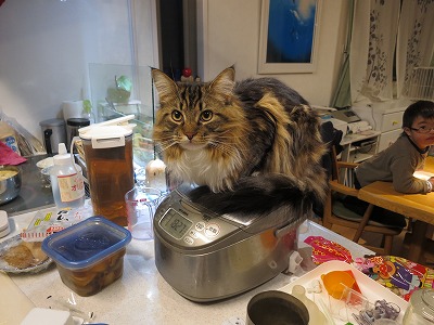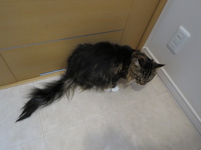 しばらく見ていたら、Cooは冷蔵庫の上から床にダイレクト・ジャンプで飛び降りた。