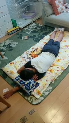 お腹が苦しいといって、洗面器を抱えて寝てしまった。