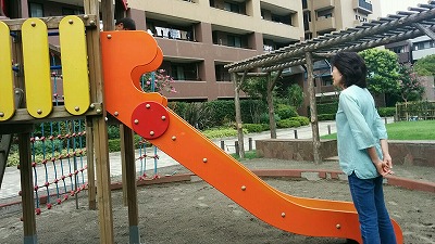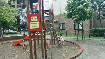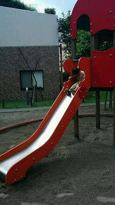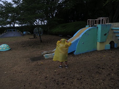 遊具があっても雨で遊べず不満爆発のH。 おまけに水たまりに靴が没した。 |
