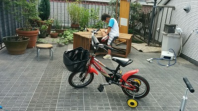 しまい込んでいた自転車を引っ張り出し、補助輪を付けた。