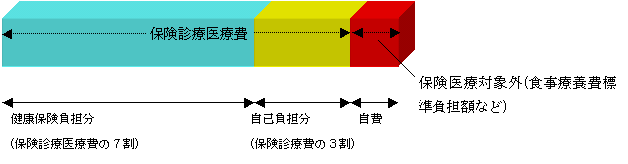医療費は保険診療(青と黄色の部分)とその他(赤色の部分)です。健康保険は保険診療の費用のうち7割を保険負担(青色の部分)とし、3割を自己負担(黄色の部分)としています。赤色の部分は入院時の食事(食事療養費標準負担額など)や医薬品以外のサプリメントを投与された場合、または保険診療として認められていない治療などが行われた場合など特殊な場合の費用です。通常の健康保険では、この自己負担分と保健医療対象外の赤色の自費部分を窓口で支払わなければなりません。しかしながら子供の場合、乳児医療制度を使えば、この自己負担分(黄色の部分)を市町村に負担してもらえるのです。風邪など日帰りで病院に受診した場合などは赤色の部分は殆ど発生しませんので、健康保険証と乳児医療証を提示すれば、窓口での支払いは「ゼロ」になります(乳児医療の一部負担金がある市町村もあります)。