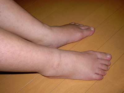 平成15年6月9日(月) 悩まされる足のむくみ。 左足の甲を見ると、盛り上がっているのがわかります。 |